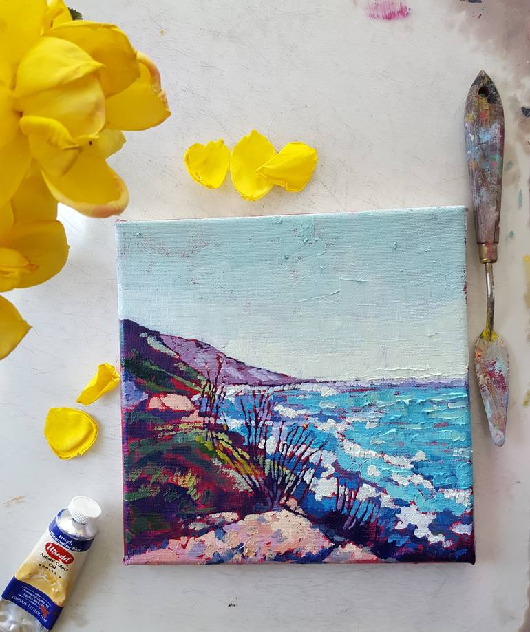 Views of Big Sur Oil on Canvas 8 x 8 x .5 in, approx. 2018 The Artwork Inspiration Big Sur is a rugged and mountainous section of the Central Coast of the California between Carmel Highlands and San Simeon, where the Santa Lucia Mountains rise abruptly from the Pacific Ocean. It is frequently p...