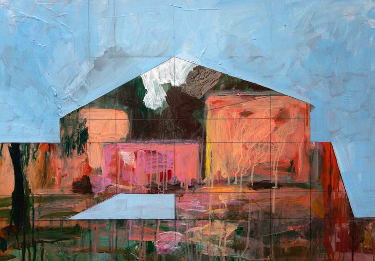 This painting draws upon the colours and forms of La Cuadra San Cristóbal by Mexican architect Luis Barragan. A new series considering the impact of architectural structures on the land in the light of the ideas of Frank Lloyd Wright. "Architecture should be of the land, not on the land" The la...