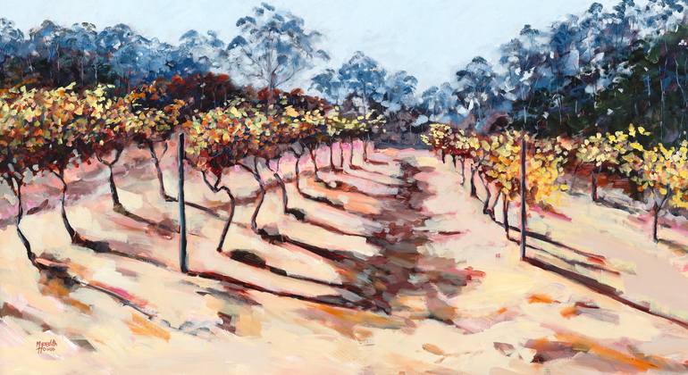 'Vineyard Vintage' by Meredith Howse is inspired by the renowned Vasse Felix vineyards in the Margaret River wine region of Western Australia. Capturing a sunlit vineyard, this artwork is brought to life with bold brushstrokes and dynamic movement, reflecting the energy and beauty of the landscape. ...