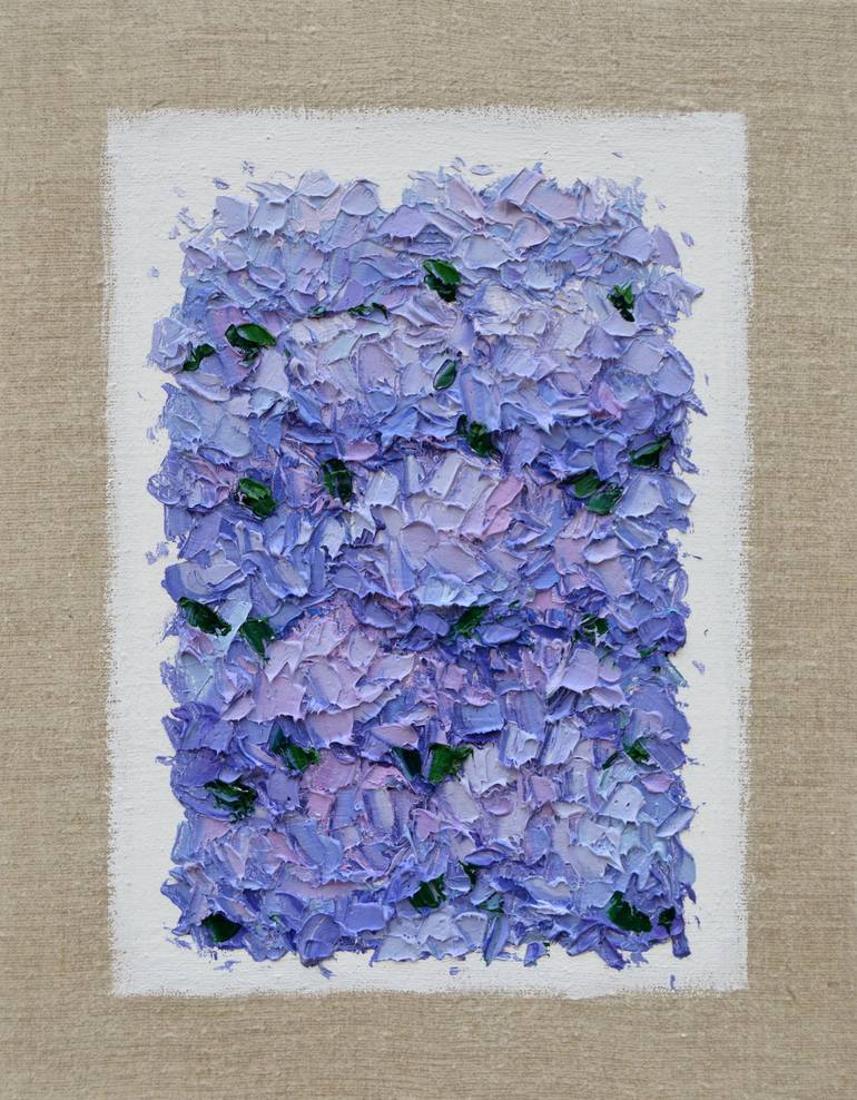 Heavily textured abstract hydrangea painting on raw Belgian linen. Wired and ready for hanging or framing.