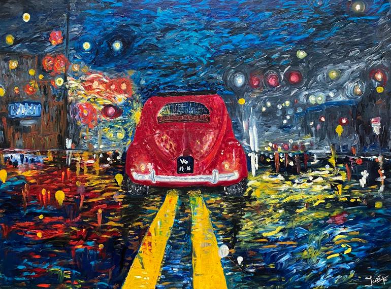 This vintage car with Venetian blinds is completely finger painted. Each and every finger stroke lovingly tells stories of the vibrant lights and the colors of the street that beautiful night. The smell of rain and it's aftermath that blurred out the reflections of the street. We did catch glimps...