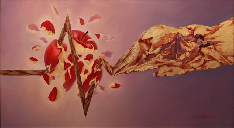 This modern wall art " "VITAL SING" is a wonderful wall decor & home decor and valentines day gift. Explosion and blast of red apple with heartbeat and pulse rate. Lovers kiss in a passionate embrace in golden pastels. valentines day gift, wife gift for valentines day This wall art decor will decora...