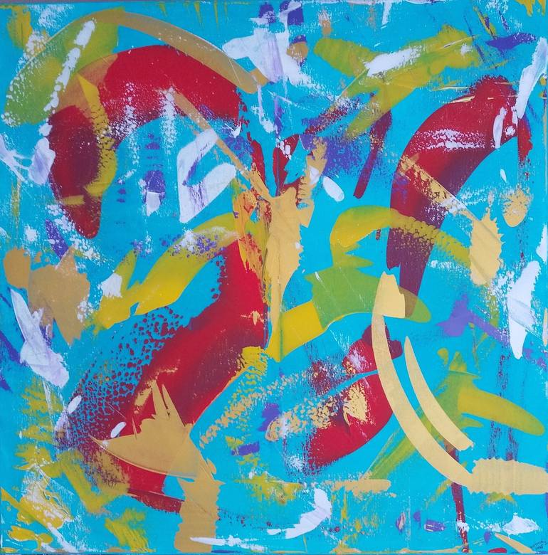 Acrylic on canvas "Vivace2" 90x90cm 2025 original signed... Vibrant splashes of red, yellow, and blue intertwine, creating a dynamic and lively composition. Bold brushstrokes and overlapping colors give the piece a sense of movement and energy. -------------------------------------------------------...