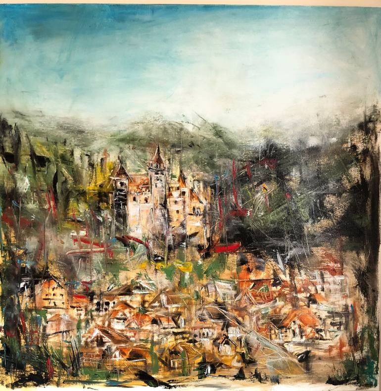 Landscape inspired from a photo of Dracula’s village and it’s castle. A view from the top that shows the village, the castle and the mountains in standing still. A great artwork in oil on canvas, unique style.
