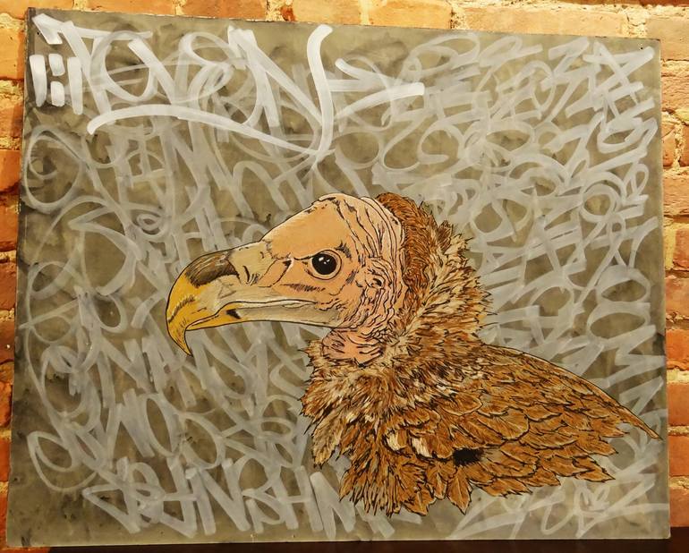 This is a piece that combines painting and wheatpasting. The vulture's head was drawn on paper and colored with colored pencils, acrylic paint and oil pastels. I used a photo of a vulture that I took at the Baltimore Zoo for this piece. The background was done in a graffiti style with a paint marker...