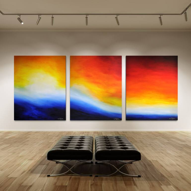 WAITING FOR YOU ON PRISTINE SHORES II triptych 2022 The Morning – The Day – The Evening. Lights and colours during the day are different. There are similarities, but every phase of the day stays independent und has its very own feelings. The sea was, is and always will be a major place of longing f...