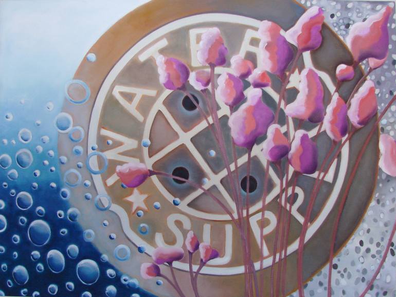 I am interested in the patterns on Manhole Covers. The pattern speaks to me and helps me create each painting. In this piece I have used a manhole that says "Water Supply". I am including landscape elements as part of each piece because the manhole is inseparable from the landscape it lives in. Th...
