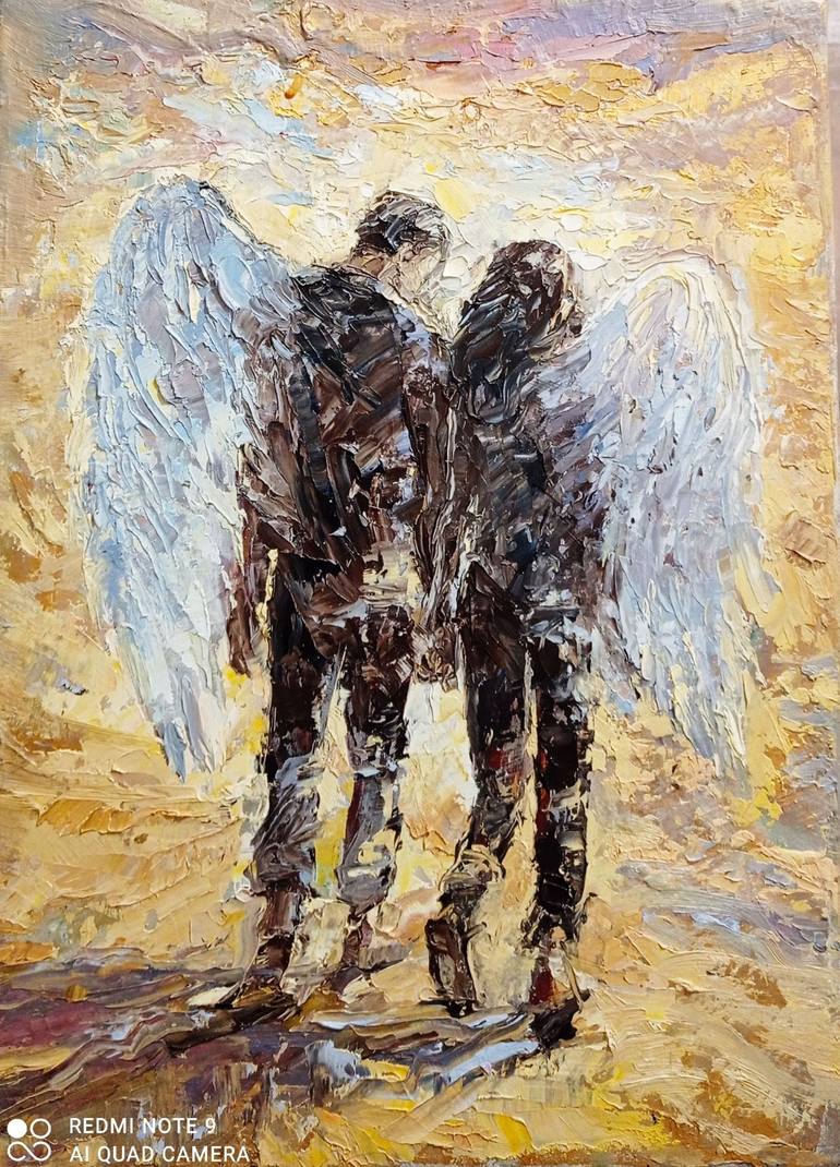 I expressed in this picture the unity of souls in this world, souls who have found each other, to whom love gives the power of wings. Two wings for two, symbolizes inseparability and responsibility for each other before eternity .. where do two beings go, holding hand by hand, who have become one ....
