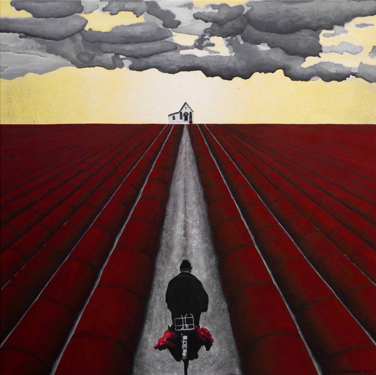 A floral landscape with a man on a bike. He is going to bring flowers to his deceased love. I assemble original photography, assorted papers, acrylics, oil, charcoal, ink, and pencil in my works. The variety of resources I am able to use has proved indispensable to me. Having always loved the appea...