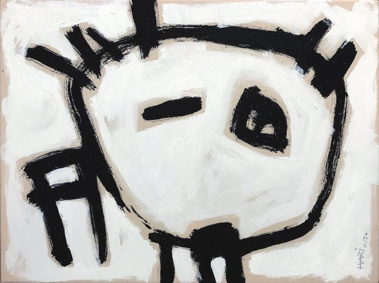 A face is winking to you. Its painted in expressive brush-strokes. Pure and in two colors, black and white. The painting comes ready to hang.