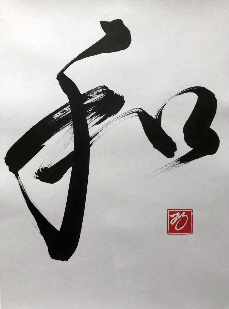 Wa meaning harmony. Japanese calligraphy original artwork signed, ink on xuan paper, wet-mounted and unframed. Wa combines the character pliancy next to the square meaning mouth. The idea being to be considerate in verbal intercourse with others – to be civil, courteous and tactful.