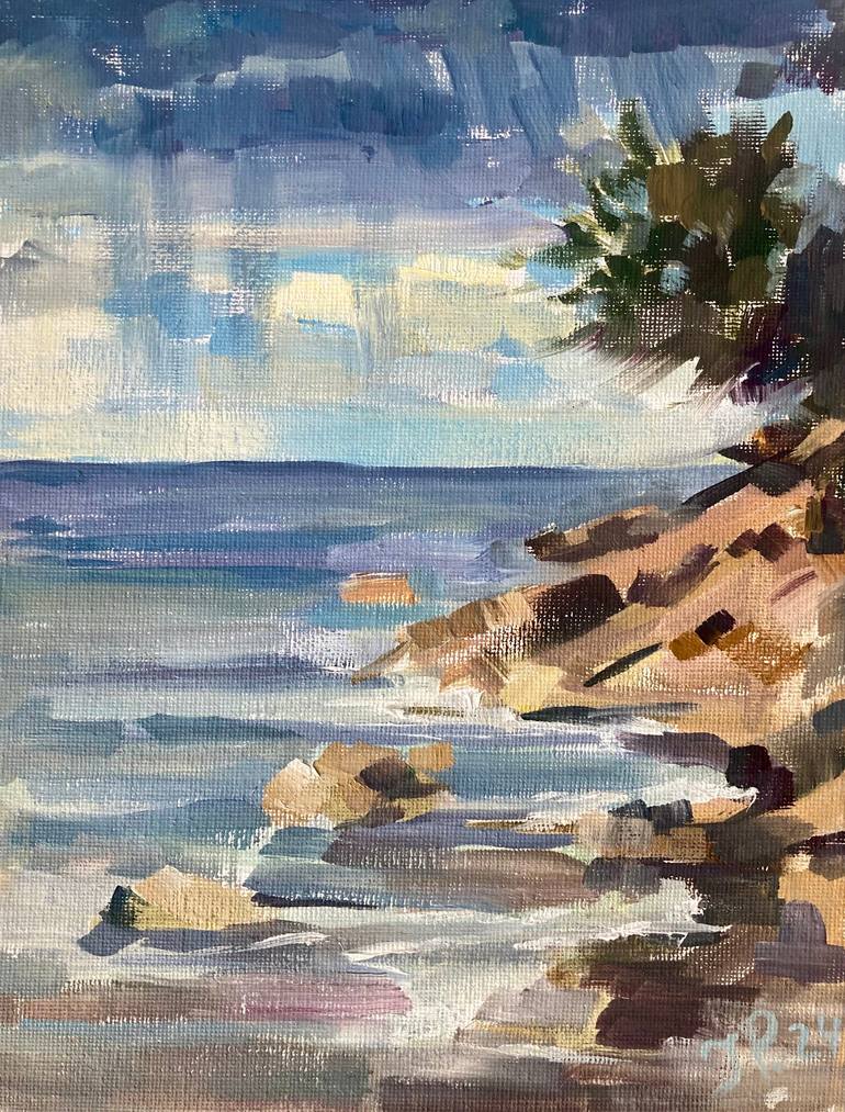 Rocky seashore before rain. It's already raining over the horizon. The painting was made en plein air in Cyprus. The famous rocky coastline of Cyprus.
