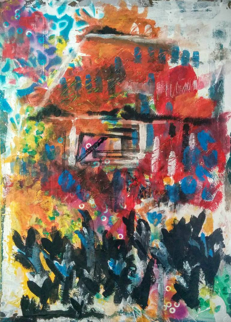 With this painting I want to express a feeling of "home", warmth, safety and serenity. I use a lot of red in order to express passionate commitment, affection and warmth. Plants are over-growing this house and thereby making it ever safer. It's a hide-away, a place for healing and positive emotions...