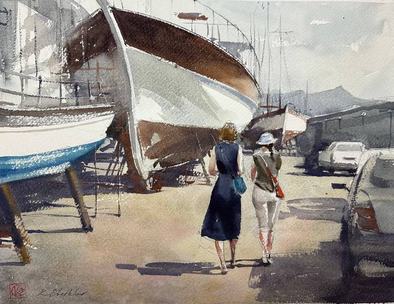 This work was painted after our trip to Antalya, Turkey. The yachts were in shipyard getting prepared for the summer. I was impressed by the atmosphere of the shipyard and the Mediterranean vibe.