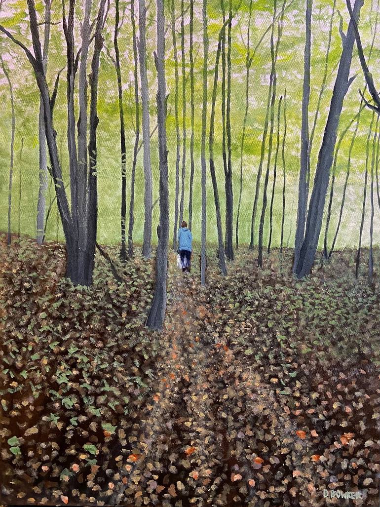 "Walk in the Woods" captures a peaceful moment: a lone woman on a trail, immersed in the quiet beauty of an early fall day. The impressionistic style evokes a sense of calm and reflection. Crafted with oil paints on canvas, the image gracefully extends around the edges of this small artwork, creati...