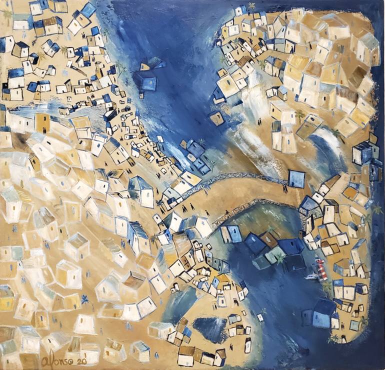 The purpose of my artworks looks to create and experience within the spectator and sensibilize the human condition. Main idea it’s every individual be the artwork’s protagonist and being transferred its persona to the environment I created. I create environments and landscapes from towns with people wandering around. People roaming on my messy cities have the objective to surround the observer and get them involved in what it is happening; proximity to houses, light & people around, darkness, daylight, etc. Every element looks forward the observer make himself a question, where it’s going? Is going to take more time to get home? Is the dog lost? The artwork title plays a vital role, I look forward spectator get deep into the painting, for example, on Blue door, you will see the artwork in ocre color, the main idea is you observe the painting more in a detail and not just find the blue door but watch ever other detail embedded into it.