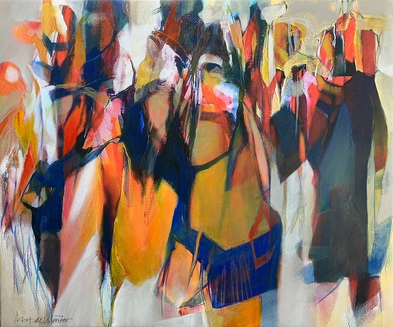 I started in my art-education with photography, but changed quickly to art, design and illustration. After the Academy of Arts I landed in Amsterdam and stayed there for 23 years, then running a creative centre elsewhere. Now i live and work in the North of the Netherlands, where I created a only-Art-related-environment: member of group of artists and participating in an Art-foundation. About my artwork: At first sight there is a lot of movement in my paintings, but if you look closer there is no direct movement at all. The figures are there, they look at you, but you can't look them in the eyes. They want to stay incognito. They do not want to be recognized. It is all a structure of lines, together with an often simple use of color. About my other artwork: Every year I paint images of completely abandoned villages and empty flat landscapes.