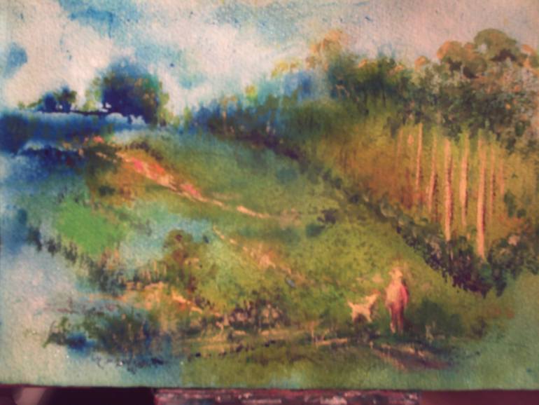 I enjoy working in mixed media, in a loose and expressive style. With this freedom of expression, using acrylic inks and salt, I have created this subject close to my heart - the hills and forests in Wales. The man and dog walking in the lush green countryside, with the misty hills in the backgro...