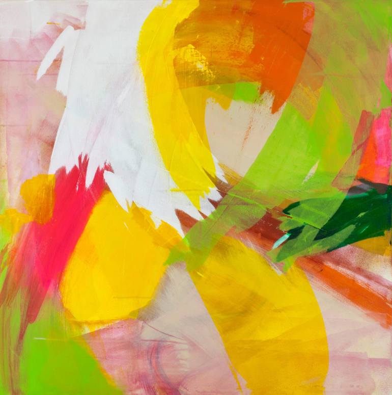 I am a contemporary painter and screen-printer. My work as an artist references the ever-changing outlines of the landscape. I look at the shape and structure when creating my paintings, which are very gestural, exude energy and movement and are often on a large scale. Colour is integral to my work. Prior to becoming an artist I worked in the fashion industry surrounded by beautiful fabrics and textures. This, I believe, has been a big influence on me in my practice. I use a cocktail of bright and vibrant colours with a dash of fluorescent pinks, oranges and yellows. I let the colours and layers mix themselves on the canvas. For me the act of painting is a continuous process, always changing, always taking away to create something new. My recent body of work is based on a recent trip to India. In the North I was blown away with the intensity of colour and the vivacity of the cities. The South, in contrast, did not have the intensity of colour but had a more muted and hazy atmosphere. It is the combination of the two that has helped me create a new colour palette in this series of paintings.