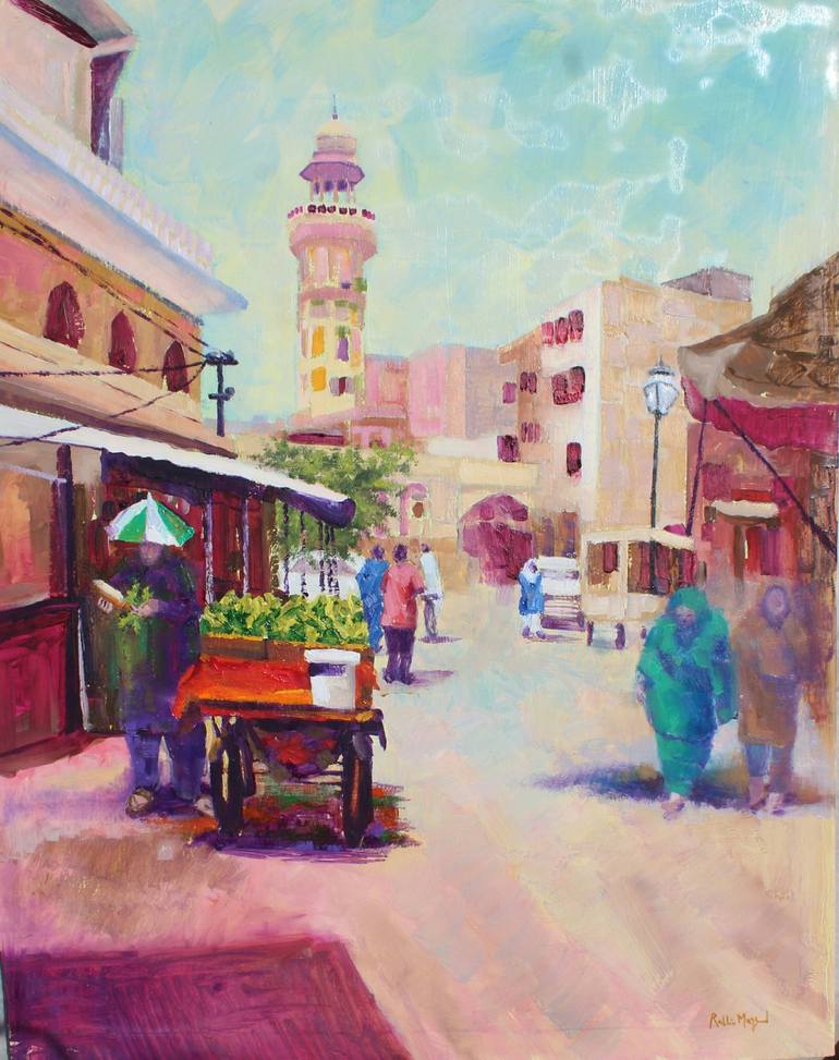 The walled city of Lahore is a well-known artistic subject for artists in Pakistan. The street life is rich with interesting movements and aesthetic architecture. I painted this artwork in my own expression to add some drama.