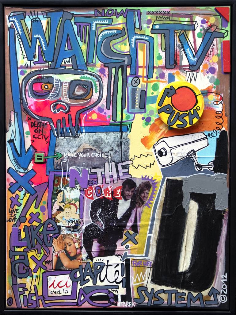 Step into a world where media, pop culture, and urban art collide with Watch TV, a striking piece by Tarek. Blending collage, graffiti, bold slogans, and retro elements, this colorful composition delivers a vibrant and ironic critique of consumer society and the power of imagery. With keywords like ...