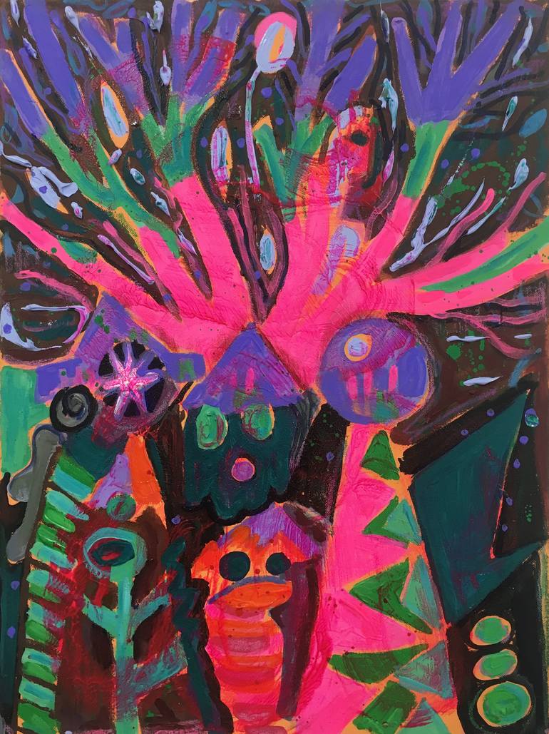 I employ bright colors and shapes with acrylics that immediately grab the eye. My work is a bold and memorable display with colors used in signage to noticeably capture an otherwise forgotten moment. The loud colors represent femininity, courage and strength in a modern world. Perhaps related to not wanting to let go of a memory and the desire to be remembered. I am inspired by the vibrant colors and patterns of folk art and crafts. Although color takes precedence in these paintings. Shape interaction and patterns play an important role. They are like rhymes that harmoniously flow through my compositions. My images are dreamy fantasies transforming the subconscious to another place I also think about the autonomous drawings of the surrealist or drawing without conscious thought. Regardless of the common domestic plots there is nothing completely ordinary in my world of painting. They bravely incorporate a carefree style. One moment of creation may not necessarily be safely carried to the next painting. My work has a range of figures, symbols, patterns that switch from recognizable to abstraction. This arrangement exudes a surreal dreamlike quality. The paintings weave in and out of my dreams. They dive into the mind and bounce out to bold world of art. Fantasy transforming into materiality. Ultimately I like to think of how my artwork and femininity takes place in the modern world. I channel memories, ancient wisdom and dreams of women from the past. My patterns and electric colors with dynamic shape interaction bring a new femininity, boldness and bravery, as we face the uncertain future.