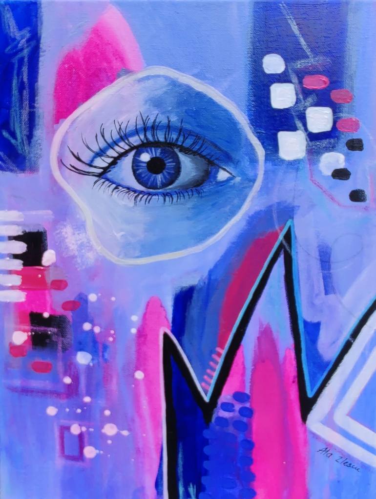 Original mixed media painting by Ala Ilescu "Watching you sleep" 16 x 12 inch "Watching you sleep" 2021 Mixed media: acrylic, watercolor crayons, ink, and acrylic markers on canvas. Modern, contemporary, abstract painting. Signed on the bottom. Gloss finish.