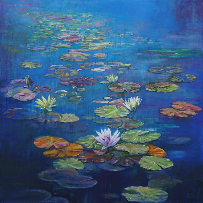 Semi abstract painting of a pond with Water Lilies fading into the distance. I love these beautiful flowers wherever I see them. Of course Monet's beautiful garden at Giverny is an inspiration. I have been trying to do a painting that does them justice, I think I now have.