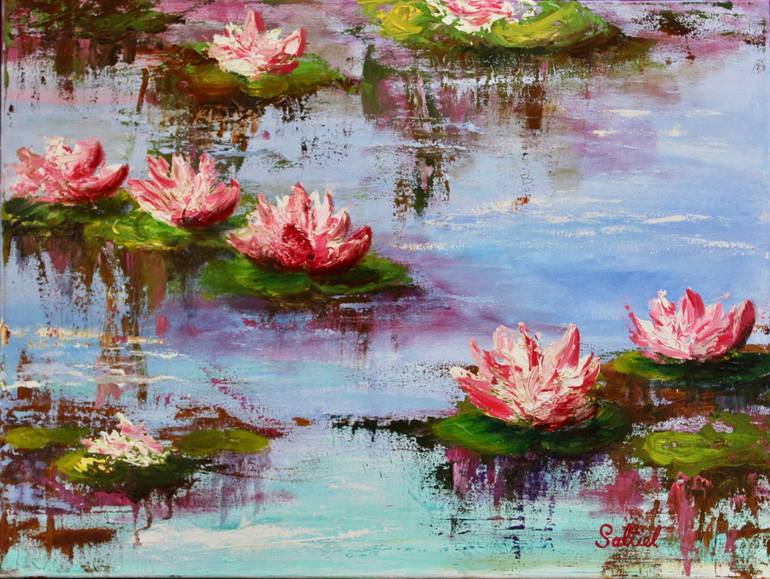 Kimberly Saltiel is an American artist who has lived and studied art for 20+ years in France, Japan and the US. The artist's love of nature and innate optimism is reflected in her vibrant color palette, diverse subjects and evocative works. Saltiel lends her elegance and grace of hand to "Water Lil...