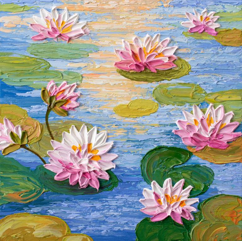 This is an original water lilies at sunset painting. Created with a palette knife using acrylic on stretched canvas. The edges are painted, so your new painting is ready to hang. Two coats of varnish have been applied for protection. The painting will come accompanied by a Certificate of Authenticit...