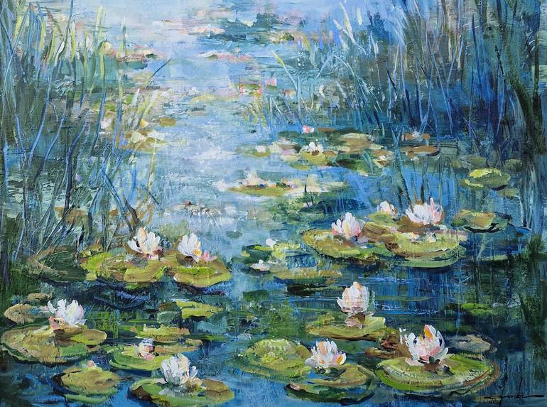 The water lily pond painting, 80x60cm. The sides of the picture are grey painted, the varnish contains UV protection.