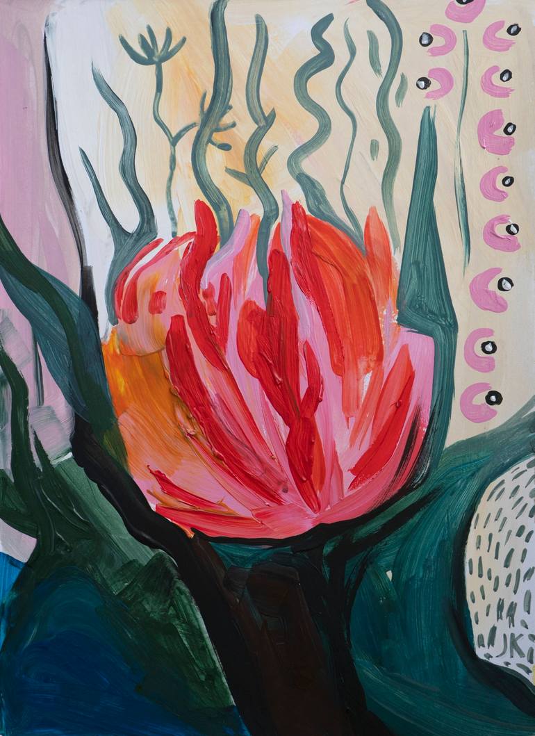 This painting features a stunning water lily in vibrant red and pink hues, set against a backdrop of rich greens and soft pastels. The intricate details and flowing lines evoke a sense of serenity and grace, capturing the essence of nature's beauty. The composition exudes an elegant charm, making it...