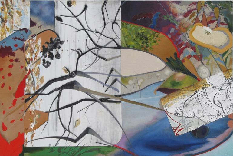 This painting started with a collage of my handprinted monotypes. The larger black and white section is silkscreen monotype. The smaller diagonal section is a carborundum monotype. I attached these pieces and let the rest of the painting build from there. I found the prints to be dynamic starting po...