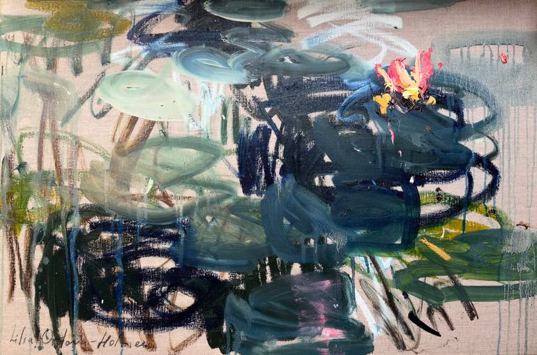This is a beautiful painting of water lilies, a semi-abstract work rendered with expressive, gestural brushstrokes. The artist used oil on canvas to create this original artwork. The painting evokes a sense of calm and contemplation, reminiscent of quiet moments spent by a lily pond. The reflection...