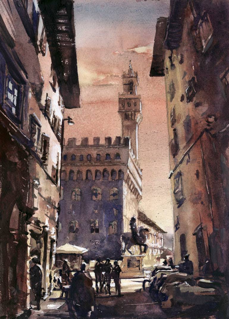 Watercolor painting of bell-tower of Palazzo Vecchio in the medieval city of Florence, Italy. Painted by artist Ryan Fox. Ryan Fox is a signature member of the American Watercolor Society as well as 6 state and regional societies- Northeast, Georgia, Illinois, Pennsylvania, Missouri, and North C...