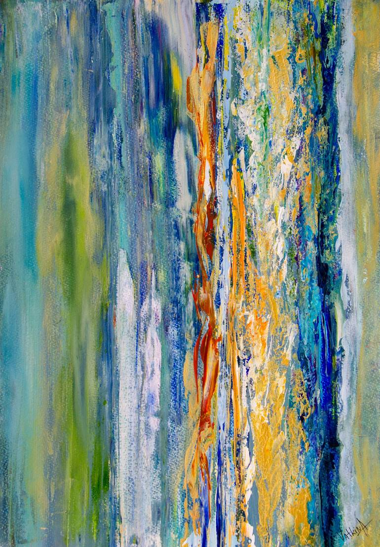 "Waterfall of Light. Focus" is an abstract painting that blends vibrant blues, greens, and yellows with striking gold accents, creating a dynamic and textured composition. The light blue background sets a serene tone, while vertical streaks of paint in the foreground evoke the imagery of waterfalls ...