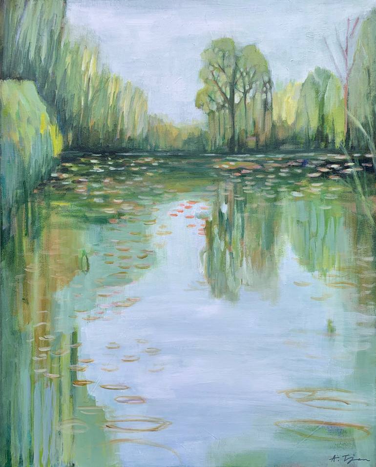 Inspired by the trip to the Monet's waterlily pond in Giverny, France. This piece focuses on creating the peaceful and serene landscape where the viewers can breathe and meditate. Comes with Certificate of Authenticity.