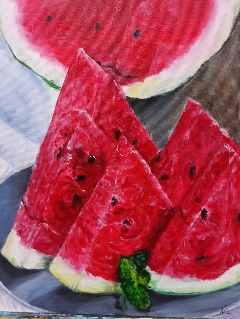 I like to paint still life. I hope that through this painting everyone will be able to feel the juiciness and sweetness of the watermelon- and as we know it is very good for our health.