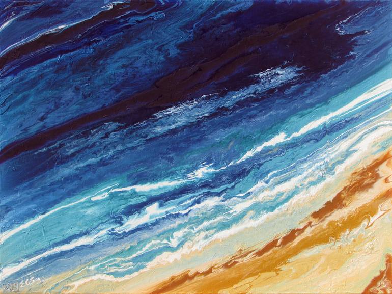 A sweet memory of vacation at the golden sandy beach, sun, blue waves, and the gentle wind. Spontaneous painting with all edges painted with continual drips of colors, coated with semi-gloss varnish as protective layer, the back is strung with wired and ready to be hung without frame.
