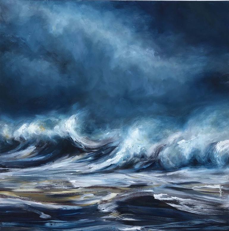 A dramatic and abstracted seascape composed of layers of oil paint and ink. The artwork explores the themes of movement and transformation, and unites the physical landscape with the world of the mind as the artist captures her own consciousness as well as the mood of the scene. Oil painting on st...