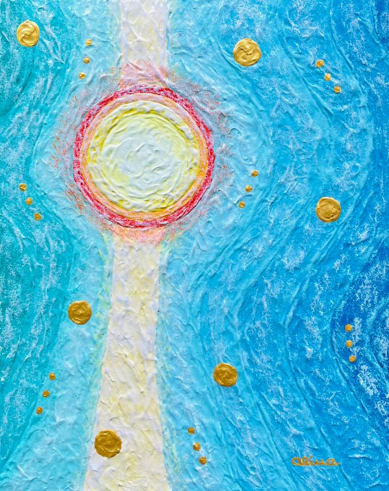 Textured hues of blue and turquoise are depicted in a wavy pattern together with gold accents. The work was painted with acrylic on stretched canvas board, it is signed in the lower right corner, and it is sealed with acrylic varnish to protect from fading and moisture (requires framing).