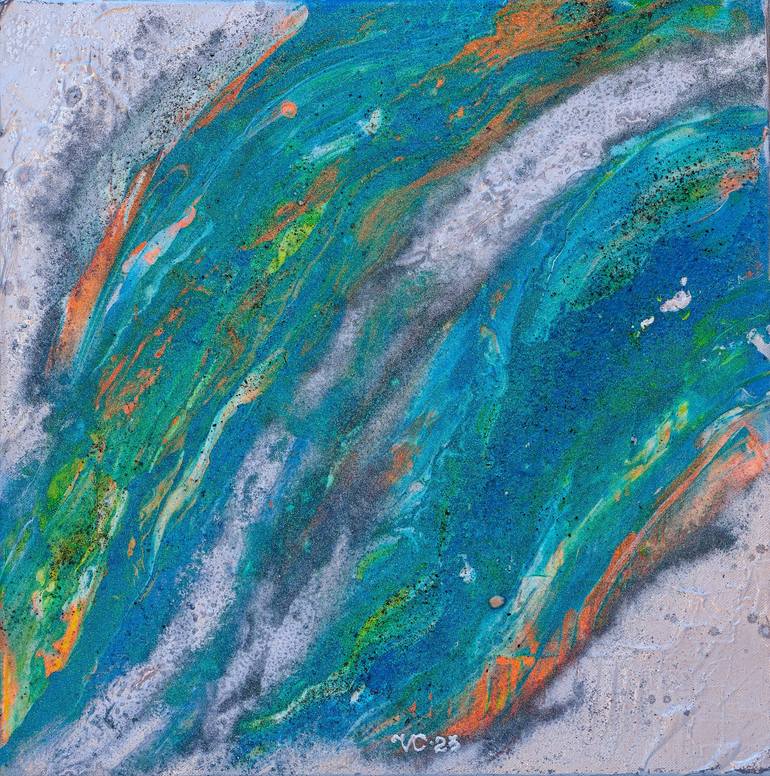 The artwork is executed using the fluid acrylic technique on canvas, incorporating acrylic paints, sand from a Montenegrin beach, and a spray can. The artwork features abstract, wave-like lines and spots in various shades of blue, green, orange, and silver. The texture is diverse, with visible relie...