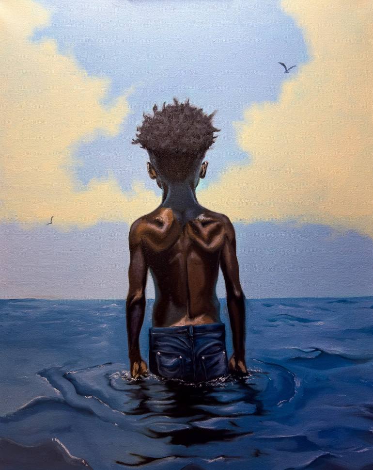 In this evocative painting, a young African American boy stands waist-deep in calm water, his demeanor serene amidst the chaos that surrounds him. The gentle ripples reflect the soft light of a fading sun, symbolizing his quest for tranquility in a world filled with noise and turmoil. The contrast ...