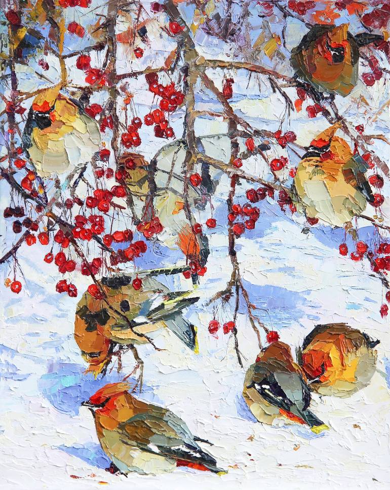 With the onset of cold weather, bright birds for the city landscape appear on the rowan bushes. In Russia, the waxwing is a resident of the taiga, including the forest tundra. The beauty of these birds is incredibly mesmerizing. The bright picture with red rowan and waxwings on winter background. Th...