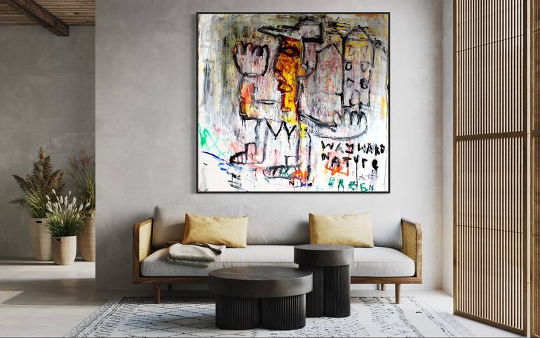 Green paints directly onto raw, unstretched canvas, working instinctively, without preamble or pause for thought. His earliest work was observational and figurative, with a kind of meticulous precision, but, having demonstrated this precocious skill, he felt free to cast-off formal technique and to work in a more expressive way, characterised by loose, vivid unpredictability. The first impression is of gestural vitality and rich painterly effect – bright colours merge into murky smudges; sharp definition blurs into misty formlessness. There are sweeping lines; scribbly detail; indistinct colour washes; paint drips, flows or clumps into crusty accretions. Suggestions of formal structure are quickly subverted. Amidst this abstract maelstrom there are hints of crude calligraphy, figuration and human faces – ambiguous, half-formed, partially erased. “The last decade has been about dissecting the human form in a process that is energetic, spontaneous and organic. I now find it more powerful to capture the essence of a person rather than to render an exact image. The paintings I make today are one-offs that I couldn’t replicate. They are unique to specific moments, authentic to me. I don’t look for or seek inspiration; I live my colourful life and allow that to guide the path for my practice.”