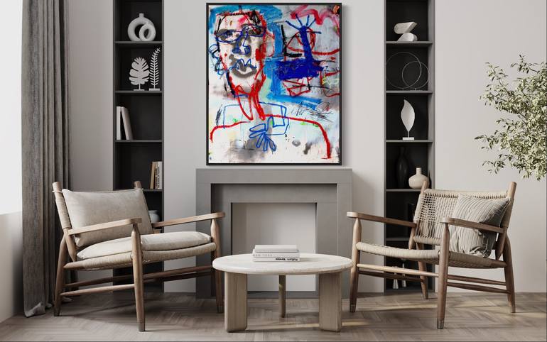 Green paints directly onto raw, unstretched canvas, working instinctively, without preamble or pause for thought. His earliest work was observational and figurative, with a kind of meticulous precision, but, having demonstrated this precocious skill, he felt free to cast-off formal technique and to work in a more expressive way, characterised by loose, vivid unpredictability. The first impression is of gestural vitality and rich painterly effect – bright colours merge into murky smudges; sharp definition blurs into misty formlessness. There are sweeping lines; scribbly detail; indistinct colour washes; paint drips, flows or clumps into crusty accretions. Suggestions of formal structure are quickly subverted. Amidst this abstract maelstrom there are hints of crude calligraphy, figuration and human faces – ambiguous, half-formed, partially erased. “The last decade has been about dissecting the human form in a process that is energetic, spontaneous and organic. I now find it more powerful to capture the essence of a person rather than to render an exact image. The paintings I make today are one-offs that I couldn’t replicate. They are unique to specific moments, authentic to me. I don’t look for or seek inspiration; I live my colourful life and allow that to guide the path for my practice.”