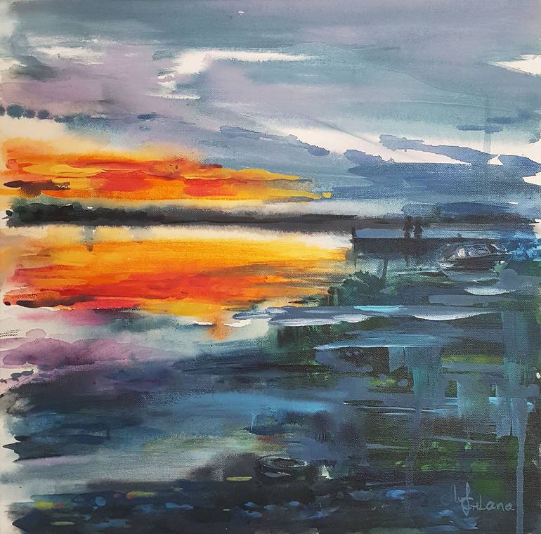 Blue suggests the sea and sky; they are visible naturally and most abstract. We will meet where the sky touches the sea, and we meet the sunset. Feel the soul, feel the atmosphere. Acrylic painting on canvas, framed and ready to hang.