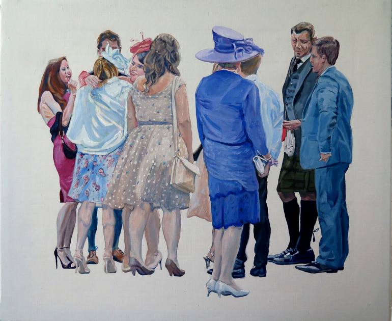 At the door of a church a group of guests wait for the bride while they greet each other. All are dressed in the most conventional fashion for the event. It belongs to the series "The Blanche Line" that aims to reflect the reality of the contemporary world. Signed and dated on the reverse. Professio...