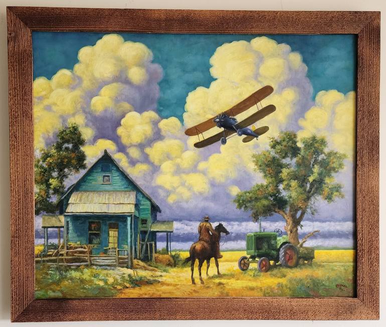 A cowboy sits atop his sturdy horse and gazes up. A biplane, piloted by his son, soars gracefully in front of the golden clouds. Welcome home! A tranquil moment where past and present meet in the bond of a special family reunion on the grassy plains of Texas. While driving thru the countryside m...