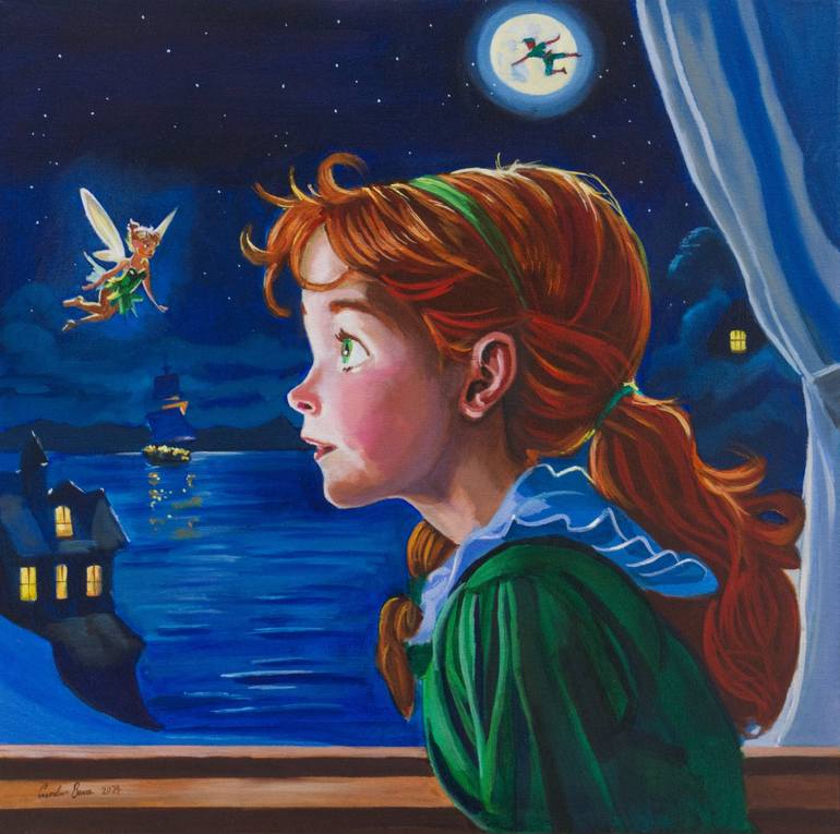 In this enchanting oil painting titled "Wendy, Tinker-Bell, and Peter Pan in Neverland," Wendy from Peter Pan shares a tender moment with Tinker Bell, who hovers nearby, their conversation illuminated by the soft glow of the moon. Against the backdrop of a starry night sky, a pirate ship sails on th...